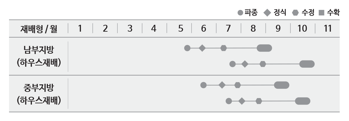 ⑤ 숙기는 착과 후 약 50일(여름재배기준) 정도입니다.